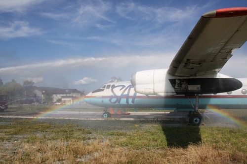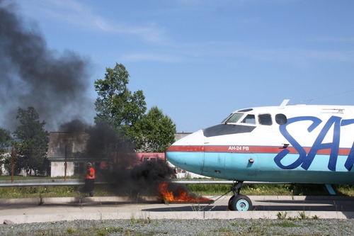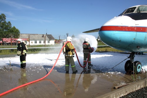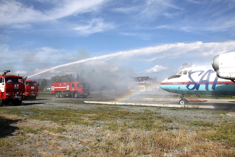 В аэропорту «Южно-Сахалинск» на этой неделе проходят тренировки с личным составом пожарно-спасательных расчетов службы поискового и аварийно-спасательного обеспечения полетов. Целью тренировок является отработка действий по тактике тушения пожара разлитого топлива и пожара внутри фюзеляжа воздушного судна.